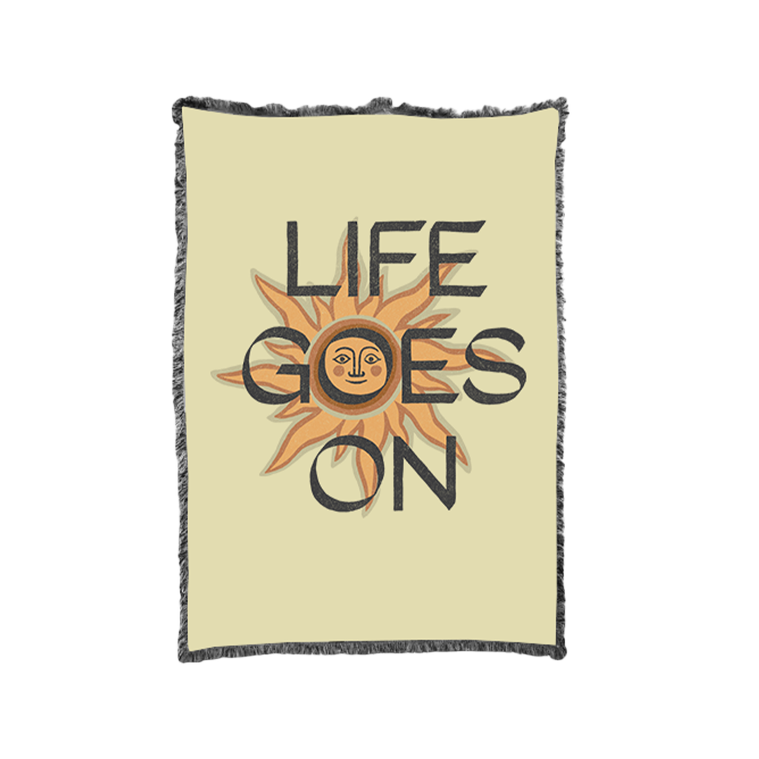Picnic blanket with Sundial artwork and Life Goes On text print.